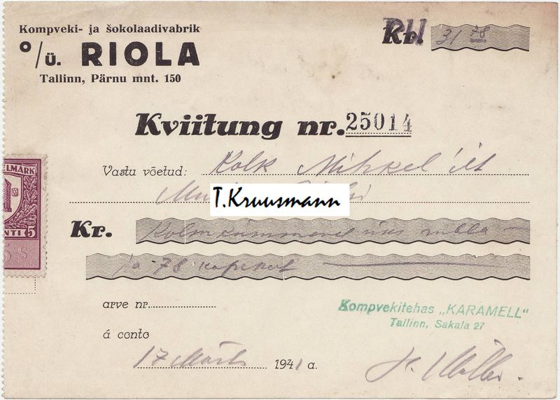 Pilt 1 - Karamell-Riola_Tallinn_Kviitung_nr.25014