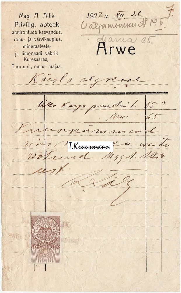 Pilt 1 - A_F_Kriegsmann_Patent-korken-fabrik_Riga_arve